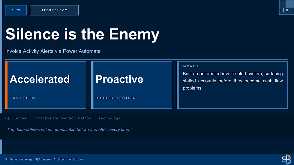 How building an automated invoice alert system using Power Automate replaced reactive collections with proactive intelligence, accelerating cash flow and reducing overdue accounts across the AR portfolio.